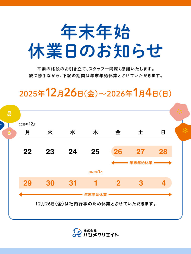 2025/12/15 (月) 2025年度 年末年始休業のお知らせ