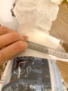 ▲金尺を布などの柔らかく滑らせやすい被せの上に乗せて当てながら抑えるように貼り付けていく。(手元になかったのでキッチンペーパーで代用(笑))