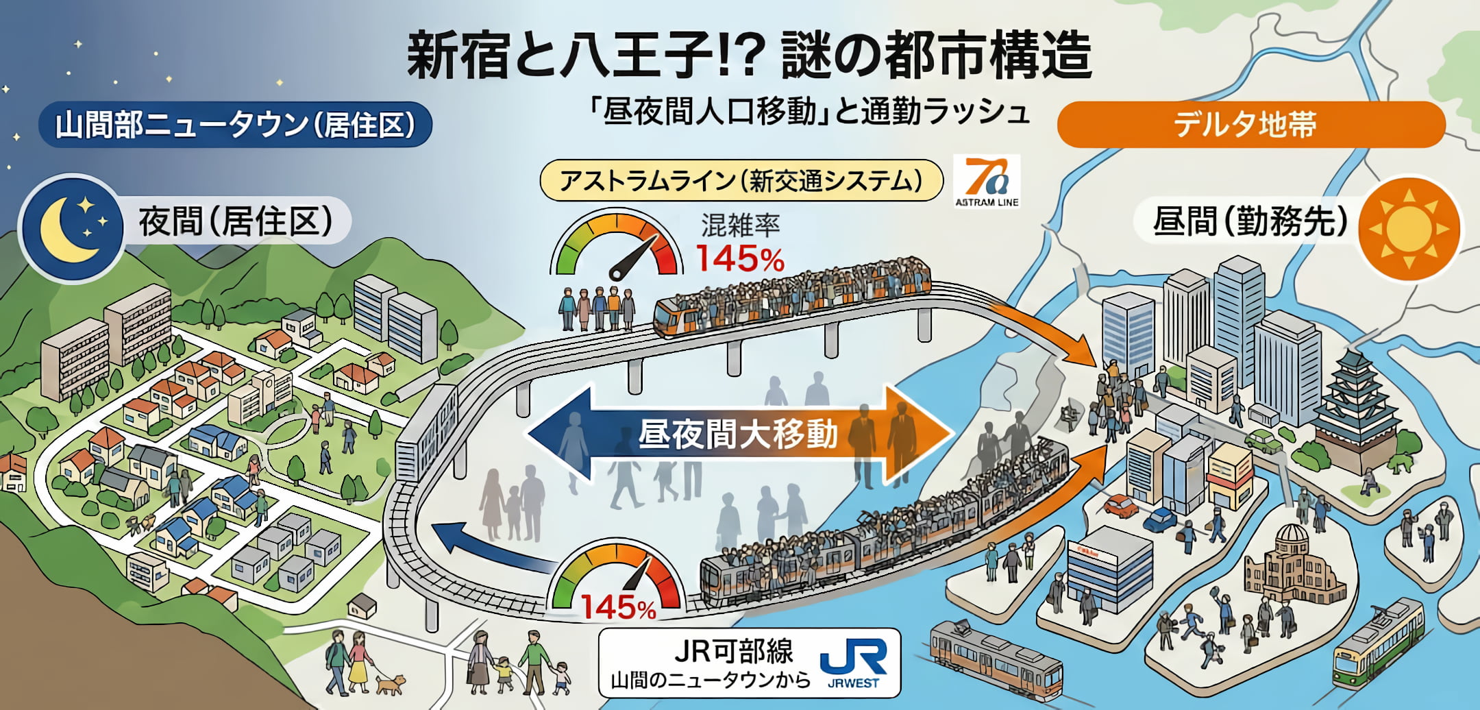 • アストラムライン:平日朝の混雑率は145%最近のニュースより)