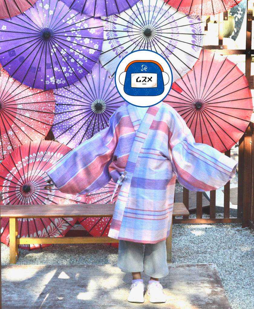 写真は、スタッフ一同の近況報告-2025年春篇-(https://hajimecreate.com/labo/springblog-2025/)のときの、ちまちま織り続けていた烏城紬の作品が完成したので娘氏に着せてみた、の図です。