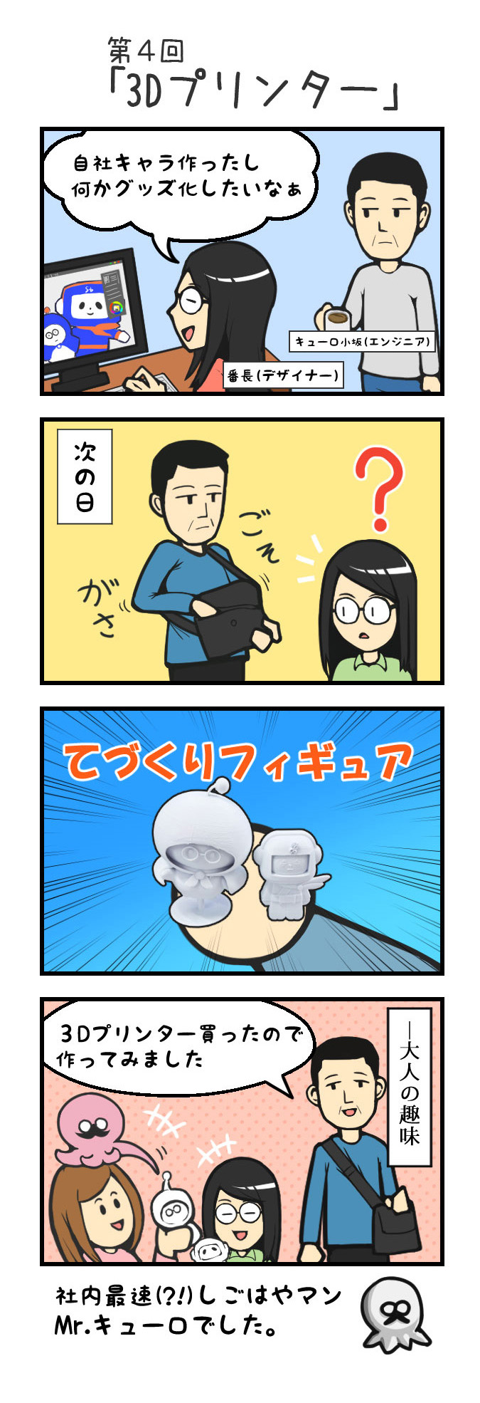 最近個人的に3Dプリンターを購入したエンジニアの赤迫が、自社キャラの一◯(ハジマル)とネオタローのフィギュアを作ってくれました!(笑)