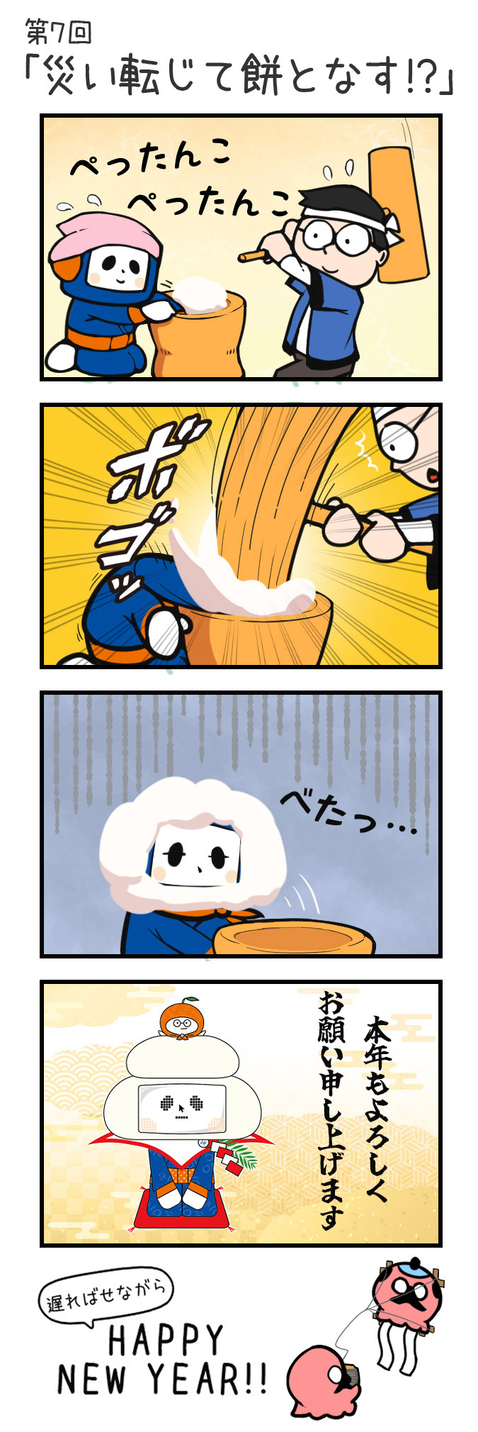 今年の年賀状の「鏡餅ハジマル」誕生の舞台裏を描いたのが、今回の四コマでした!